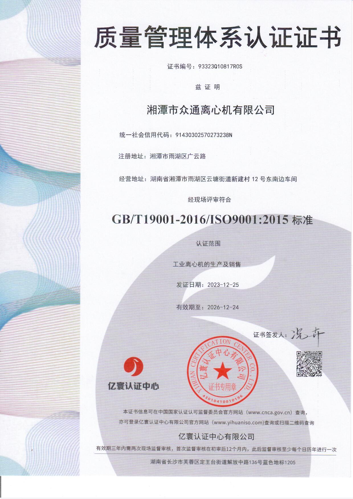 湘潭眾通離心機質量體系認證證書
